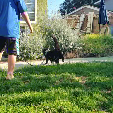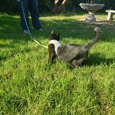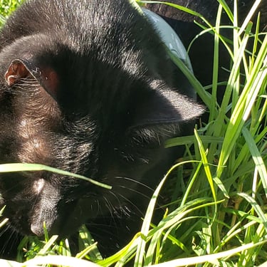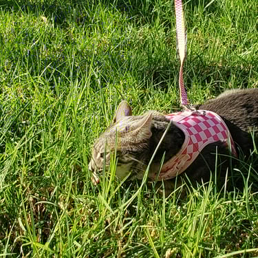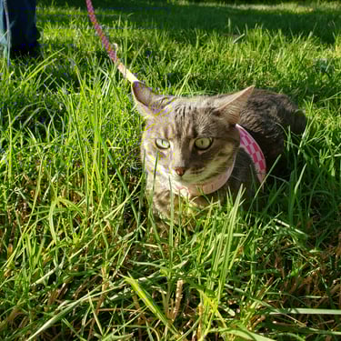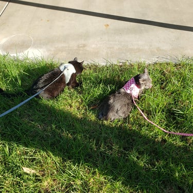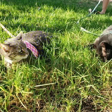 Later that day, we took the cats outside for the first time. Binx l0ved to be outside, he was not scared. Penny was very scared and her tail was puffy. Binx walked around the yard, eating grass. Penny laid in one spot eating grass. Both cats enjoyed the sunshine.